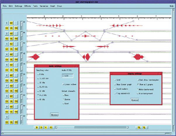 I then decided to do an even more ambitious port, Dr. Hammer's Mix package. Mix is a 9-channel audiofile mixer with graphic waveform displays, graphic volume and panning curves, a scripting language for complex mixes, and real-time effects processing. (See Figure 1.) Obviously, audio playback capabilities are exploited to the full. I thought porting Mix would be by far the most difficult challenge, yet with Richard's replacement libraries (and some judicious code-cutting), I was quickly able to compile the Mix application, and Linux now has an excellent 9-channel, sound file mixer.