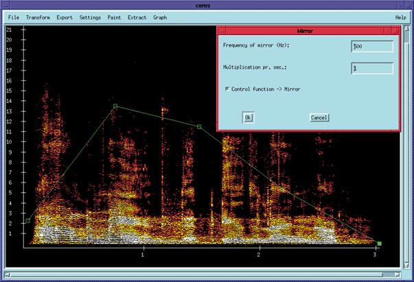 Ceres is an FFT-based program, but its design goes far beyond the simplicity of Sono and PTPS. Ceres renders the FFT results into a graphic display which can then be edited directly and saved as a new sound file. The challenge in porting Ceres was primarily in the X programming. Since no real-time aspects were involved, there were no problems with audio playback. There were, however, problems with the use of variable-length Xt argument lists which, in theory, must be terminated with a NULL entry. The SGI compiler and libraries did not appear to require this NULL; however, the Linux GCC compiler and libraries were stricter, and Ceres would fail with a segmentation fault upon opening if the NULL was missing. In addition, a problem with different maximum random numbers (RAND_MAX) between SGI and Linux caused a crash when using the Random Sieve transform. Once these two problems were solved, the porting of Ceres was complete.