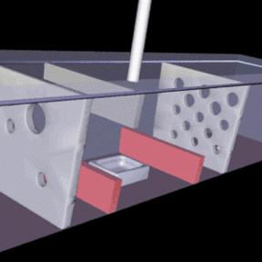 A lot is happening in the pipeline shown in Listing 3. First, the “mesh” polydata set gained two attributes: scalars and vectors (e.g., SetScalars, SetVectors). The vectors were created in a vtkFloatVector object. Their magnitudes were calculated and stored in a vtkFloatScalar field called field. The scalars are used by the mapper to color the vectors, and the vector data is used by the vtkHedgeHog (vector plotter) to create the oriented and sized vector glyphs. A separate pipeline is used to draw the surfaces of the object, and a 7-case switch is used to build the point connectivities for the surface panels per cell. It takes advantage of any connectivity which may exist on a given cell and builds a special type of polydata called “triangle strips”. Triangle strips allow n connected triangles to be created with n + 2 points. The vtkPolyData must be told that the given cell array values are triangle strips in order to properly set up the connectivity. This is accomplished with the SetStrips method, as compared to SetLines in the mesh example. The panels are made transparent by setting the opacity to .5, which allows the vectors to be seen. The color map for the vectors has been explicitly set to range between the minimum and maximum velocity magnitudes. By default, the mapping is red-to-blue from 0 to 1. The SetScalarRange method allows the range to be reset in the mapper. Notice the red vectors in the back left corner of Figure 3—an error is creeping in from the boundary and the location where it begins is very clear. Apart from verifying the correctness of the mesh, boundaries and boundary conditions, I can easily diagnose trouble spots in the calculation.