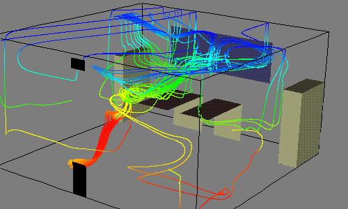 Finally, these last two figures demonstrate some of the advanced features of VTK. Figure 4 is a BMRT-rendered (Blue Moon Rendering Tool) export from VTK. The complex shapes were built entirely from contoured implicit functions. Figure 5 is from the VTK examples directory and shows streamlines emanating from “seeds” that are located at a heater vent.