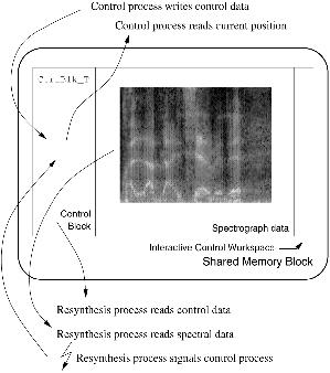 1. The user can select a playback speed from the speed slider, in which case the rate of advance through the spectrogram is under control of the resynthesis process. It is necessary to update the green line when the resynthesis source is moved automatically by the resynthesiser, and of course this happens asynchronously with the GUI events. The solution is to arrange for the resynthesiser to signal the parent when an update is required.