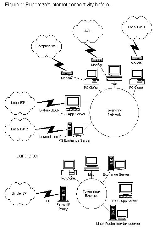 First, we ordered and set up a Dell Poweredge 2200 (Pentium II, 200MHz, 64MB RAM) with Caldera OpenLinux to be our e-mail post-office (using Sendmail) and primary domain name server (using BIND). We finalized a deal to install a firewall from AT&T. Now, we had a unified Internet gateway, and could shut off all the other expensive or insecure conduits, thus removing the need for modems in the offices (see Figure 1). This also allowed us to take full advantage of our registered ruppman.com domain name, standardizing our e-mail addresses to the format firstname.lastname@ruppman.com.