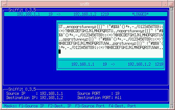 In Figure 1, you can see two IP addresses: a destination and a source. The source IP is sending packets from port 19 to the destination IP, 192.168.1.2. Notice that port 19 is “chargen” and does nothing but send characters. (Packet sniffing works only in situations with high bandwidth.) If the source and destination port are changed to 21, any TELNET sessions from 192.168.1.1 to 192.168.1.2 can be picked up, thus allowing the viewer to see what the TELNET user is typing in his session. If the user is using ssh instead of TELNET, the viewer would see only useless garbage.