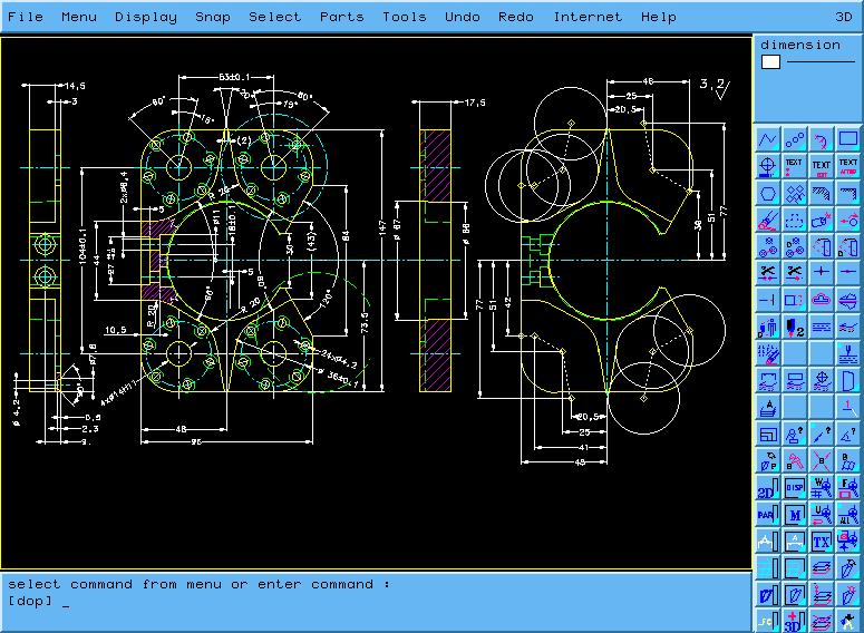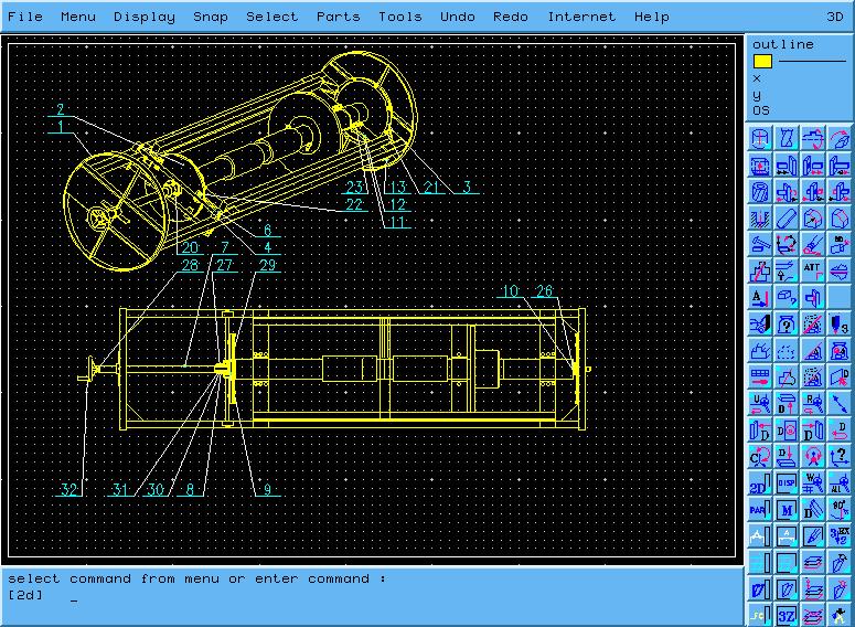 The command line at the bottom of the window reminded me of AutoCAD, but that is the only resemblance. The acronyms varied from those I knew in AutoCAD. Selecting a menu item or icon causes the associated acronym to be displayed on the command line. Commands can also be entered manually using acronyms. Additional parameters are either entered as single letter, digit or symbol options, or by interactive selection of drawing and solid objects.