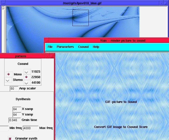 At the other end of the scale is developer Matti Koskinen's rain, a GIF-to-Csound score converter. A Csound score is the control file for a Csound instrument, providing it with such values as event start times, durations, amplitudes and frequencies, waveform selection and so forth. Matti's utility simply takes a GIF image, applies some user-defined values and magically translates it into a Csound score. The score can then be synthesized and played from within the application, or it can be saved to disk for later processing (perhaps in Cecilia). (See Figure 2.)