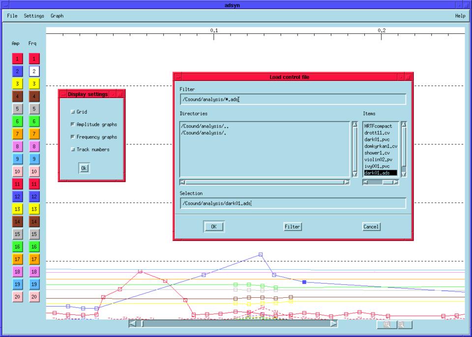 Adsyn is a graphic editor for Csound “hetro” analysis data files. hetro is one of the Csound sound file utility programs and its operation is quite simple. Using a heterodyne filter bank, it analyzes a sound file and creates a data file of separated frequency and amplitude values. That data file can be read and graphically represented by Adsyn and the frequency and amplitude components can be freely altered using the mouse. Csound's resynthesis opcode (adsyn) can be called; the edited file can then be synthesized and played from within Adsyn. Professor Oyvind Hammer originally wrote Adsyn for SGI machines at NoTAM, a Norwegian center for music and acoustics research. With his good graces, I began the port to Linux. It was finished with much assistance from Nicola Bernardini. (See Figure 3.)