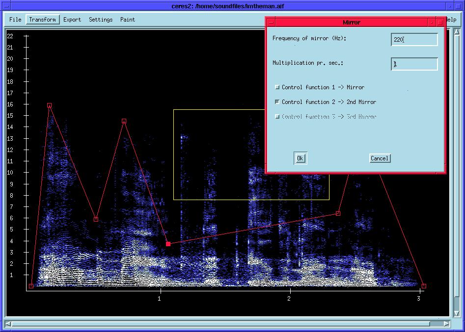Ceres2 is Johnathan Lee's enhanced version of Oyvind Hammer's Ceres, described in my September 1998 LJ article “Porting SGI Audio Applications to Linux”. Johnathan greatly extended the editing capabilities of the original software engine, which essentially performs a Fast Fourier Transform (FFT) on a sound file and renders a graphic representation of its frequency content and activity. The graphic display can be edited in various ways, a large number of transforms (spectral mutations) are available, up to three graphic linear control functions may be specified and a variety of output formats are supported, including two types of Csound scores. Ceres2 also extends some of the command-line analysis variables such as FFT size, analysis window size and window overlap. The Linux port was done by me, but it was dependent on work already done on the original Ceres with great help from Richard Kent, who also supplied the invaluable tichstuff libraries which replace the SGI libs. (See Figure 4.)