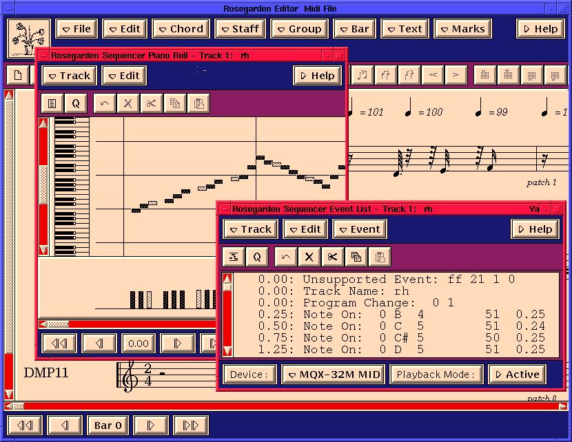 The Rosegarden suite includes a MIDI sequencer, a common-practice music notation display and the very nice feature of being able to save your work as a Csound score file. Such a tool is especially helpful for users most comfortable with standard notation conventions, allowing them to compose with their familiar symbols and then easily convert their creations for use with Csound instruments. (See Figure 5.)