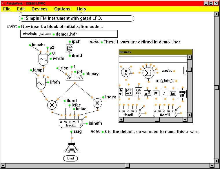 Russell Pinkston's PatchWork for Win95 is a graphic “patcher” for the design of Csound instruments. Although a UNIX/Linux version of this program exists (XPatchWork), it has not been maintained and is in need of some serious debugging. However, the Linux WINE Windows emulator can run the Win95 version, proving once again that Linux always finds a way. (See Figure 7.)