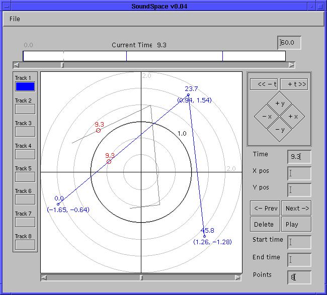 Developer Richard Karpen has generously shared many of his opcodes with the general Csound community, one of which is called “space”. In the Csound manual entry for space is a mention of a GUI for creating the values needed by the GEN28 stored-function table, and SoundSpace is that GUI. Written in core Java, this unique utility provides a visual interface for determining the placement and sonic trajectories of up to 8 sound files in the auditory space, with support for stereo and 4-channel output. (See Figure 8.)