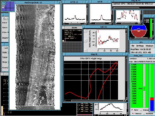 The bright green display shows how we control and designate the operating conditions for the SRA. At this time, we manually find the return signal using the slider. Once found, we click the “auto” button and the system will keep the ground in the center of our digitizer window, regardless of aircraft altitude variations. The flight map is yet another short Tcl/Tk program. It extracts GPS position data from the shared memory area and uses it to map our position.