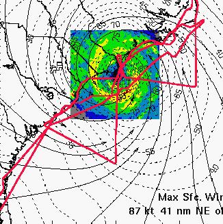 We flew two missions in hurricane Bonnie: the first on August 24 and the second during landfall on August 26, 1998. During our first transit flight from Tampa to the storm, we were able to isolate and correct the tracker bug and everything started working better than expected. Soon after leaving the east coast of Florida, our topographic display of the sea came alive for the first time, showing real sea state. Ocean waves as high as 63 feet were observed in the northeast quadrant of the hurricane on the 24th. Figure 14 shows our August 26 flight track during landfall overlaid on the aircraft weather radar image and a contour plot of the wind field data. The base image includes the weather radar, the wind field and the coastline and was provided by the Hurricane Research Division (HRD) of the NOAA Atlantic Oceanographic and Meteorological Laboratory (AOML) in Miami. We produced this overlay using Yorick.