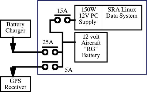 Figure 4 is a block diagram of the SRA power system. The SRA requires an uninterruptible power source for Linux and the three differential GPS receivers and computers. Instead of an off-the-shelf UPS, we went with a 12-volt 25 AH “RG” (recombinant-gas) sealed aircraft battery as the prime power source for the system. This was chosen for two reasons: