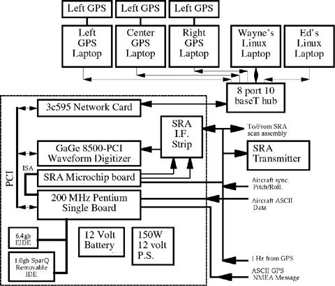 The new SRA data system, built on top of a Red Hat 4.2 system and Linux kernel 2.0.29, occupies eight inches of vertical rack space, weighs about 40 lbs, runs totally from an internal 12-volt aircraft battery and requires about 120 watts of total input power. It includes a custom ISA board with several PIC microchips which perform dedicated functions for the radar. It also includes the entire radar IF (intermediate frequency) strip, detectors and a 2ns/point waveform digitizer. No monitor or keyboard is directly connected to the SRA; instead, Linux laptops are used for all control and display. Those laptops run Red Hat 5.1 and 2.0 Linux.