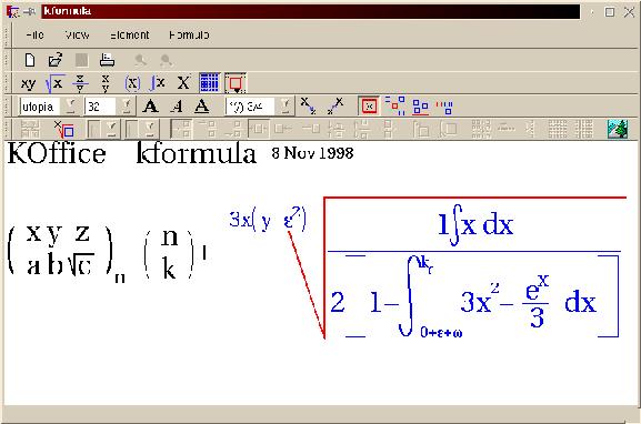 The KOffice application that is probably most advanced at the moment is KIllustrator (see Figure 5), a vector-based drawing package. It features a lot of drawing tools and is very usable. Two other applications of KOffice are KFormula (see Figure 6), a mathematical formula typesetter; and KImage, a smaller image-manipulation program. Finally, there is KChart, a component for drawing business graphs such as bar charts and pie charts; and KOrganizer, an organizer program in the spirit of Lotus Organizer that is quite usable and sports many features and different views.