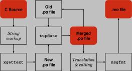 Figure 1. A block diagram representing all the steps necessary to obtain a .mo file from a C source. The most critical part is running tupdate (see below) to merge the new, untranslated strings with the previous work without losing it.