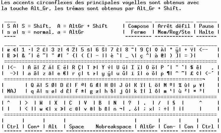 On the screenshot, you can see a representation of the French keyboard with all shortcuts shown: “MAJ” means “Caps Lock”, “Ferme” means “Close”, “Arrèt défil” means “Scroll Lock” and “Con” keys are the extended PC 105 keys (also called “Windows key”) mapped to previous console, next console and last console. This ASCII art is included in fr-latin9.map key map to remind users where all the Linux-specific shortcuts are.