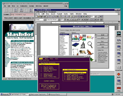 Many of our clients need to do only basic office tasks: access to the accounting system (which we can provide via a terminal session or a Java applet front end), e-mail and an office suite. An NC is a good match for these applications. Terminal emulation is provided by the TeemNC application. E-mail can be done with Navio's Netscape Navigator 3.0 for netOS. For an office suite, we install Applixware on a Linux server and execute it remotely from the NC (this is much faster than you might think).