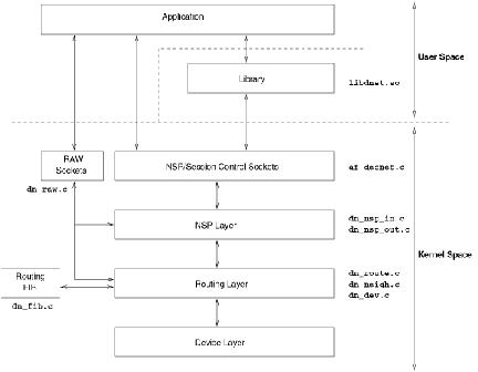 The main source file is af_decnet.c. This file contains the socket layer interface and parts of the DECnet NSP and session control layer code. Since the DECnet layering model does not map exactly onto the socket code, session control is provided partly by the kernel and partly by a user space library called libdnet.so.