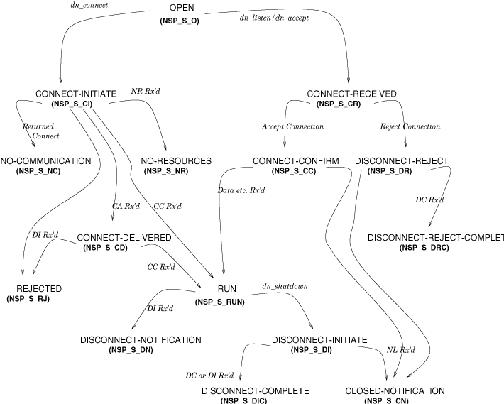 The rest of the NSP layer is divided into two parts: one for dealing with outbound packets, dn_nsp_out.c, and one for incoming packets, dn_nsp_in.c. The state table for the NSP layer is shown in Figure 2. We won't say much about the diagram here, but it should be a useful aid when used in conjunction with the kernel code.