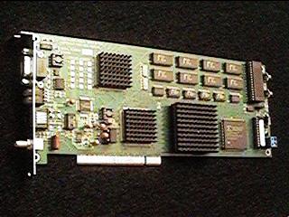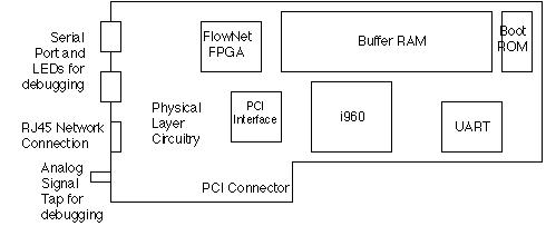 Figure 1. The FlowNet prototype is built entirely from off-the-shelf components and fits in a standard PCI slot just like an Ethernet card. In production, this board could be reduced to just two or three chips.