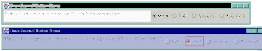 The action listener for each button just calls the UIManager class' setLookAndFeel method with the correct full class name and a utility class' updateComponentTreeUI passing in the top-level window (the JFrame subclass). This changes all components in the tree to display in the newly selected look and feel. Since some components may need a different size, we again call the JFrame pack routine, which computes the sizes of all components and makes the main window large enough to hold them all.