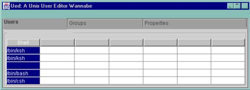 Since we want this to be a “good” application and maybe the basis for a general UNIX user database editor (read, write, validate) later on, we'll design it according to the model-view-controller paradigm from the start. I called this program Ued, originally in tribute to a much older program written at the University of Toronto around 1982 and maintained for a time by my colleague Geoffrey Collyer. My program has no code in common with that older ued. The class UedModel (see UedModel.java) is the user data portion of the program. UedView displays a list of users or groups on the screen. UedControl responds to user requests to modify the data. The main thing to note is the look-and-feel it presents (see Figure 5).