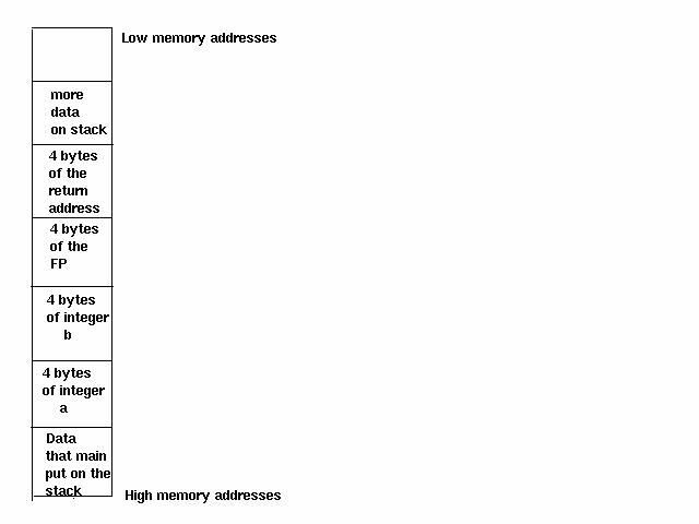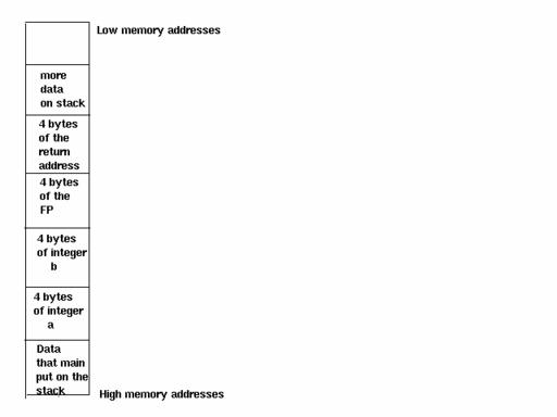 The address of a on the stack is bffff7ac The address of b on the stack is bffff7b0Integer b is four bytes from integer a. Looking at Figure 2, we see that integer b is followed by the four-byte frame pointer, then the four-byte return address.
