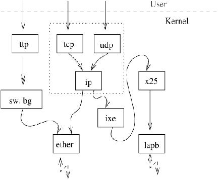 In Linux and most BSD systems, I/O modules live inside the kernel and the relations between them are more or less hard-wired into the code. As an example, the TCP/IP protocol stack is a carefully programmed set of modules with strong interrelations. It is designed to work well on typical configurations.
