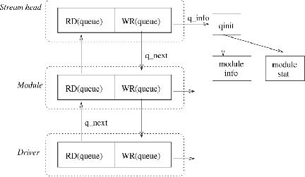 A quick overview of the LiS implementation would reveal a STREAM as a full-duplex chain of modules (see Figure 4). Each one consists of a queue pair: one for data being read and another one for data being written. Each module has several data structures providing those operations (i.e., functions) needed, as well as statistics and other data.