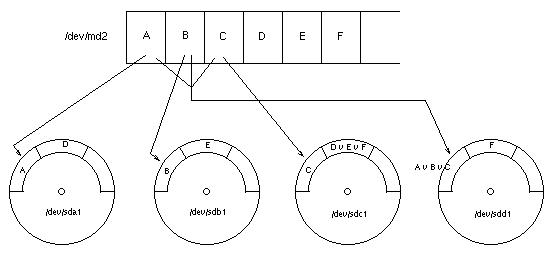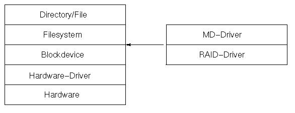 • Several different physical disks are combined and accessed as a compound element. Under Linux, this is done by the driver for multiple devices, also known as /dev/md*.