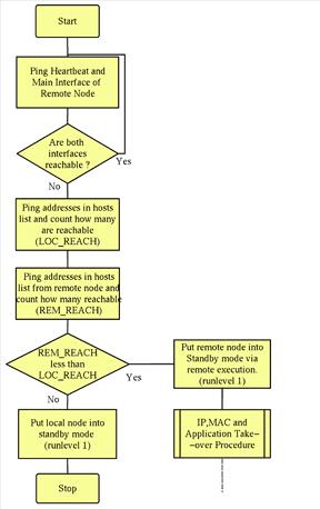 clusterd continuously monitors the ICMP (Internet control message protocol) reachability of the other node in the cluster, as well as a list of hosts which are normally reachable from each node. It does this using a simple ping mechanism with a timeout. If the other node becomes even partially unreachable, clusterd will decide which node actually has the failure by counting the number of hosts in the list which each node can reach. The node which can reach the fewest hosts is the one which gets put into standby mode. clusterd will then start the failover and takeover procedures on the working node. This node then continues to monitor whether the failed node recovers. When it does recover, clusterd controls the resynchronization procedure. clusterd is invoked on each node as: