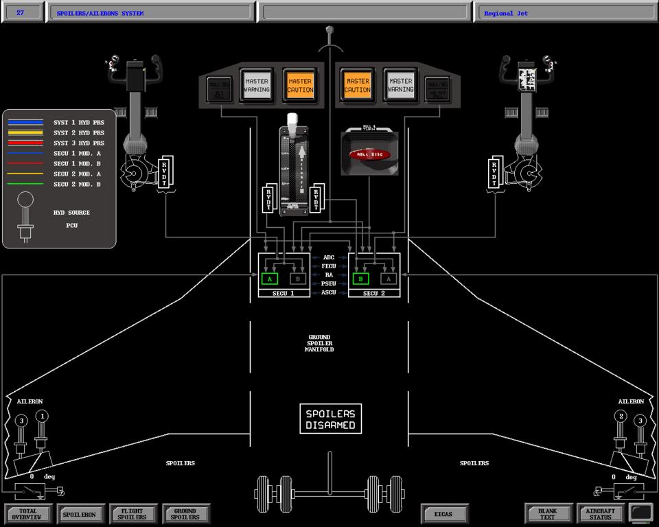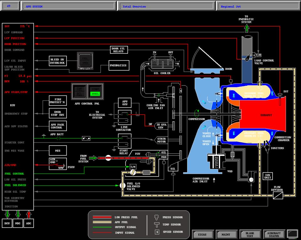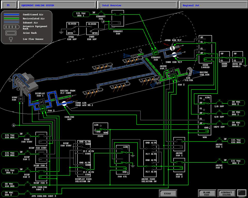 Full-flight simulators (Figure 2) are built with a complex and effective six-degrees-of-freedom motion system. This motion system is responsible for producing the realistic feeling of takeoff, landing and in-flight turbulence. The visual projectors generate the real-world images as visual references. The heart of the entire system is the host computer, which is responsible for interacting with all the avionics hardware, motion and visual systems as well as simulating the aircraft's aerodynamics. CATS are a different breed of aircraft simulation. Instead of defining a hardware interface to interact with all the aircraft panels, CATS produce a graphical representation of all the aircraft panels (Figure 3), schematics (Figure 4), Line Replaceable Units (LRUs, Figure 5), and black boxes as they are sometimes called (Figure 6). By contrast, CATS provide a quite useful tool for training aircraft maintenance personnel involved, as well as pilots. They are also invaluable as a diagnostic tool for maintenance personnel in troubleshooting and diagnosing aircraft system failures. CATS are available in three configurations: single-screen (mini-CATS, Figure 7), three-screen (CATS, Figure 1), and seven-screen (CATS System Trainer, Figure 8). This last one is a full graphical representation of the aircraft cockpit with touch-sensitive screens. This system provides the entry-level pilot and/or aircraft maintenance personnel an opportunity to master his cockpit procedural skills.