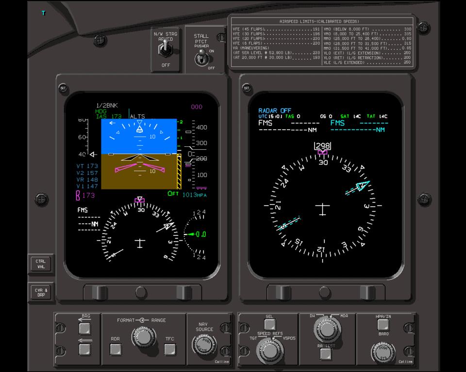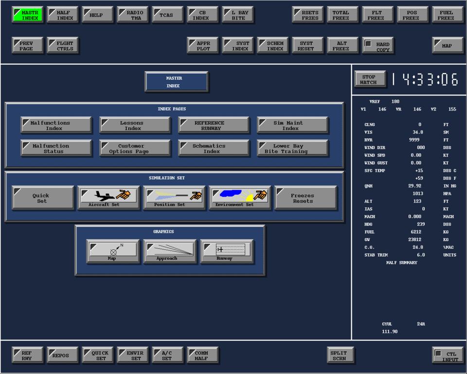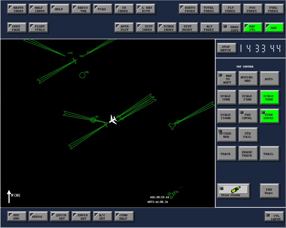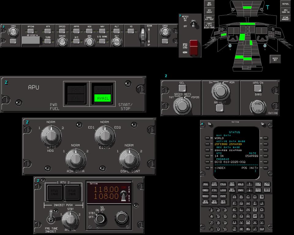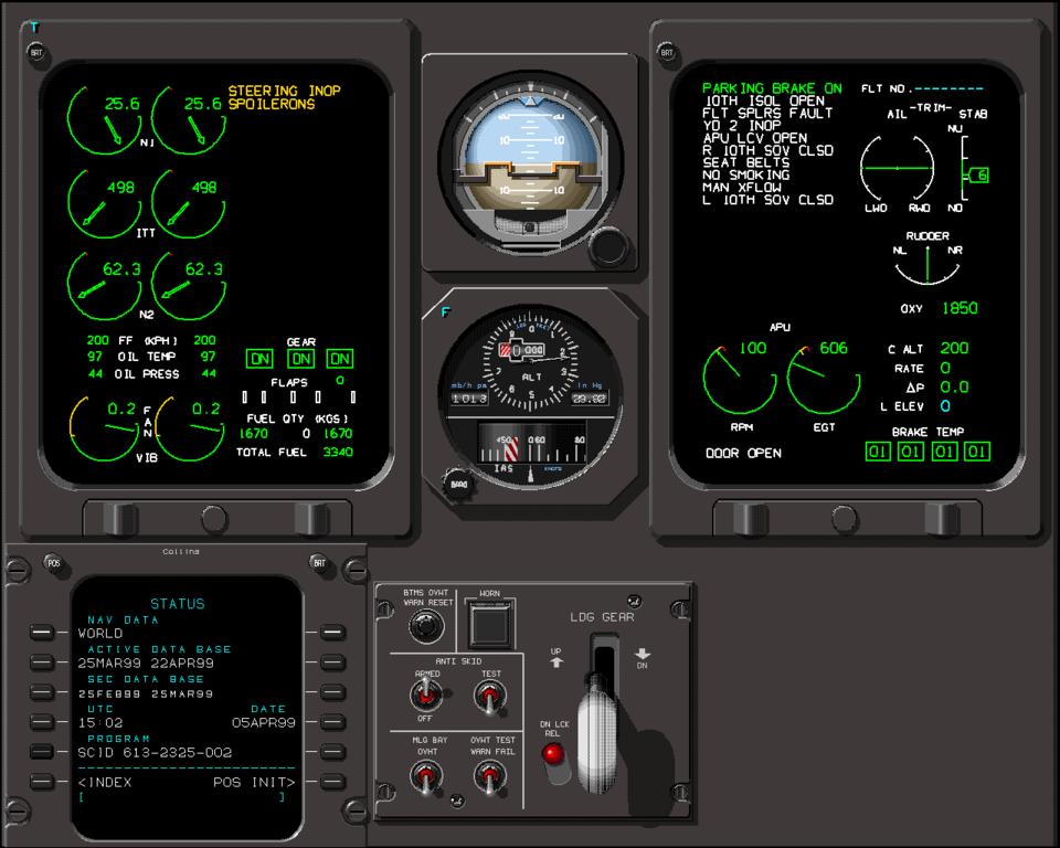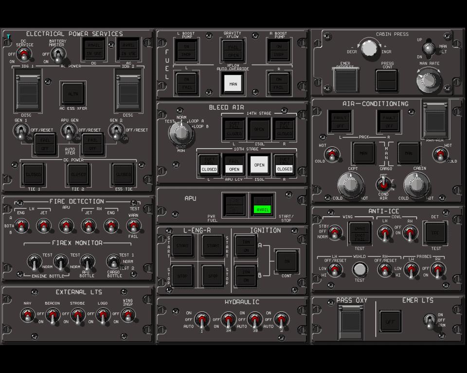 At the time TIGERS was developed at CAE, sophisticated graphic systems for simulation use were not yet commonplace. Figures 10, 11, 12, 13 and 14 show the level of graphical detail required for CATS simulation. The main difference between a CATS and a full-flight simulator is simple: CATS requires that all aircraft panels be a graphical representation, as opposed to the hardware-driven interface on a full-flight simulator. Simply put, a graphical representation of a switch is used instead of a real switch in a cockpit environment. In all respects, the amount of simulation software required is much more complex on a CATS as opposed to a real full-flight simulator. All aircraft systems are simulated in the CATS environment, instead of only the simulated black boxes of the full-flight simulator. In flight simulators, we simulate the same black boxes as used on the aircraft. In trying to address the needs of a Bombardier's training department as they sought a portable version of their existing AIX CATS on the PC platform, CAE engineering decided Linux would be the ideal and practical choice for this project.