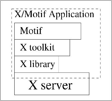 Access to the X Window System in a Motif application is accomplished primarily through three libraries: the X library (commonly referred to as Xlib) which provides the most primitive interface, the X Toolkit (Xt) upon which Motif is built and Motif (see Figure 1). A book covering Xt, or at least the Motif Programming Manual, would be a good investment if you become serious about GUI development. Many libraries choose to build on Xt rather than X, so it is reasonable to expect X and Xt to be consistent across UNIX flavors and available on any end-user configuration.