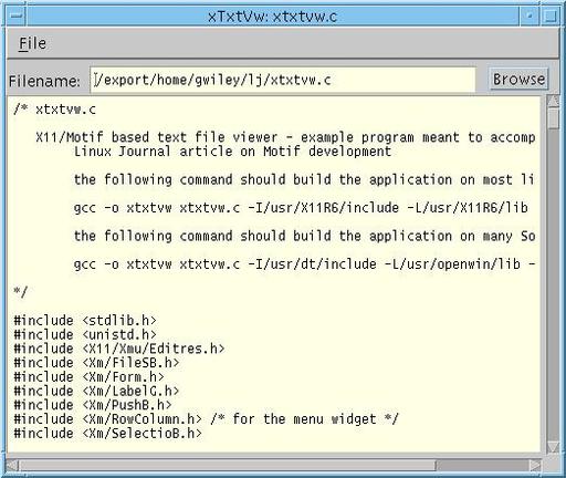 gcc -o xtxtvw xtxtvw.c -I/usr/dt/include\ -L/usr/openwin/lib -lXm -lXmu -lXt -lX11If these don't work, look for a directory called /include/Xm in the directory tree containing your X Window System and specify that directory. The libraries are typically in the X library directory—search for a file named libXm*. Motif is most often made available as a shared library; the version will vary depending on your system. If you cannot find one or the other (especially the headers), you might not have loaded the X or Motif development package.