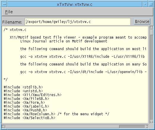 A good way to get a grip on a new technology is by looking at something built with it. Motif provides a rich and extensible environment, and it would take far too long to explain all the details behind the steps I will take; in fact, I will just scratch the surface of what can be done using Motif. The application I will use to illustrate Motif is a simple text-file viewer (see Figure 2). You should download the source (it's long) from ftp.linuxjournal.com/pub/lj/listings/issue64/3392.tgz. I will refer to specific line numbers as I explain different aspects of the Motif API.