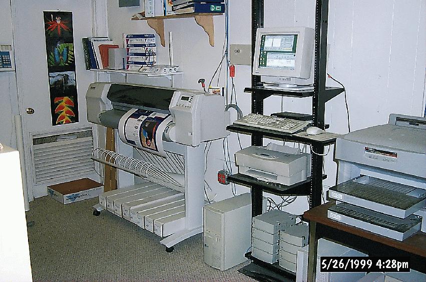 Figure 4. The Network Server and SeeColor Proofing RIP at Mahaffeys' are shown here. A digital workflow requires an accurate digital proof. An Imation Rainbow Proofer at left has been nearly idled by the SeeColor-driven HP2000CP at the left. Linux could idle the NT Departmental Server in the near future.