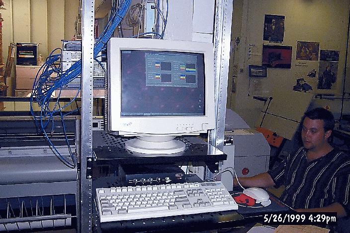 Figure 5. This Rack houses three computers. Two are Harlequin RIP that drive the Presstek platesetters and Quickmaster DI. The third is an SMP Intel machine running SuSE Linux 6.1 that houses Quality's web site (http://www.qualityprinting.com/), e-mail, FTP, DNS and proxy server for the company LAN. The network switches, T1 and DSL routers are seen behind the monitor. Pre-Press Manager Jason Clifton is shown at right.
