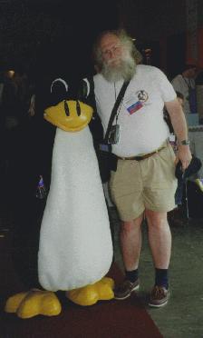 Alpha Processor, Inc., a Samsung company, announced they were joining Linux International; Richard Payne and Guy Ludden presented a check to Jon “maddog” Hall. I got the picture and then took several others of Jon, including one with a people-size Tux, who was roaming the show floor.