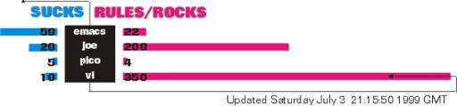 vi rocks. It also rules. So says Vassilii's Editors Sucks-Rules-O-Meter, which mines the verbs on Altavista and pronounces vi the winner over Emacs and all the other editors as a subject of those two superlatives. As of July 3, vi had a 350/10 rules/sucks ratio. And it looks like Linus isn't the only one out there who hates Emacs—a sentiment he shared with us on a recent panel that also featured Emacs creator Richard Stallman. Emacs' rules/sucks ratio is 22/59. This meter can be found at http://www.tarunz.org/~vassilii/srom/and is updated weekly. Thanks to Vassilii Khachaturov.
