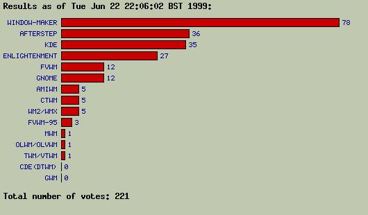 Matt Chapman's web pages at http://www.plig.org/xwinman/are devoted to Window Managers and offer the browser a chance to vote for his favorite. Here are the results as of June 22.