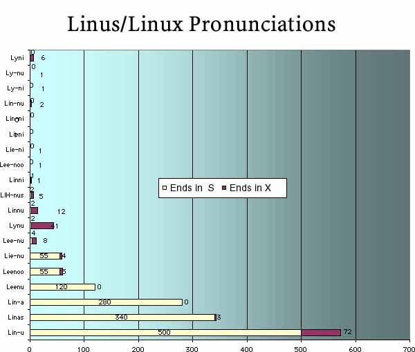 And there began the tale of two pronunciations that have done nothing but permute. There is not only no consensus on how to pronounce Linux, but this condition appears to derive from an equal uncertainty about how to pronounce Linus. The Web is full of sound files in which Linus says, “Hi, my name is Leenoos Torvahlds and I pronounce Leenooks as Leenooks.” More or less. That's Jim Choi's phoneticization of the recording.