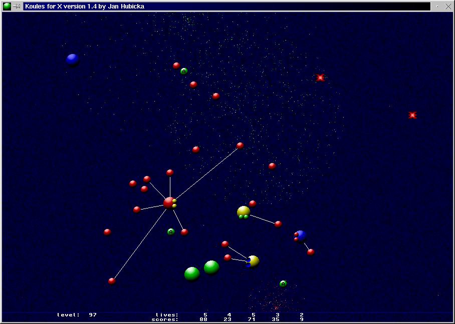 Koules is simply an excellent idea which, when developed, becomes fantastically playable. Koules supports up to five players, at a single terminal or over a network, and is more fun with multiple players. Keyboard, mouse and joystick are supported, as well as SVGA and X. Sound support is excellent and exists on multiple platforms, and there are multiple difficulty levels.