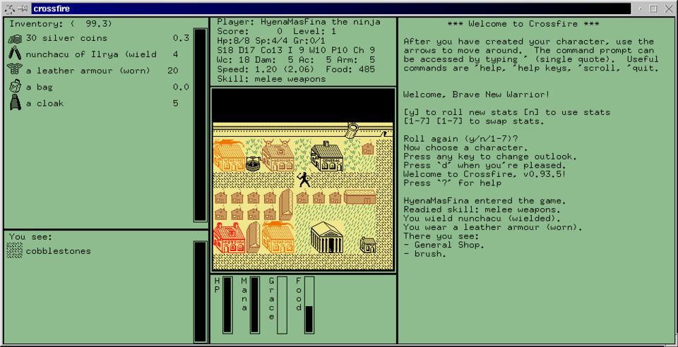 CrossFire is a different kind of game from the rest of these dungeon crawlers. The Linux Game Tome (http://happypenguin.org/) describes it as a cross between NetHack and Gauntlet, and that's actually fairly accurate. The game is graphical, multi-player (!) and immense. With over 150 different monsters, about 3000 maps, 19 character classes, about 65 different weapons, dozens of armours, helmets, shields and clothings, and 18 levels of magic available to wizards (with roughly 85 spells at last count), CrossFire is a whole different world in which you and your friends can live. Any number of people can have clients (even available for Java and Win32), but the server has to run on a UNIX-based system such as Linux. If you're tired of being an @ and want to be an animated graphic again, here's where you can do it!