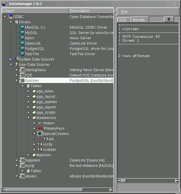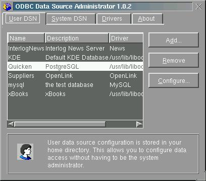 Now run ODBCConfig to add, edit or remove data sources. You will need to be root to work with system data sources, but any user can add, edit and remove user data sources. Now run the DataManager, and you should see all ODBC data sources. When you try to expand the TreeView below a data source, you will be prompted for login information to connect to the data source. You can also try to connect to your data source using the isql command-line tool. Simply execute the command: