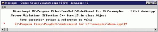 What kind of rules are we talking about? First of all, the items have each been given a rating according to the severity of the rule. The five ratings, from least serious to fatal, are: Informational, Possible Violation, Violation, Possible Severe Violation and Severe Violation (see Figure 1). An example of an Informational rule is item 2 under the Effective C++ list: “Prefer iostream.h to stdio.h.” So, for instance, if you include stdio.h in your code, one of the warnings that will come up will explain that you shouldn't use stdio.h when coding in C++ (see Figure 2). A Possible Violation is rule #17: “Check for assignment to self in operator=.” Item #22 catalogs a Violation: “Pass and return objects by reference instead of by value.” A Possible Severe Violation is something like, “Don't try to return a reference when you must return an object.” Severe violations can prove to be fatal to your program. Rule #10 is a good example: “Write delete if you write new.” Seems obvious, of course, but you may forget it and thus cause ugly memory leaks. The items are divided into different categories, such as “Shifting from C to C++”, “Memory Management” and “Inheritance and Object-Oriented Design”.