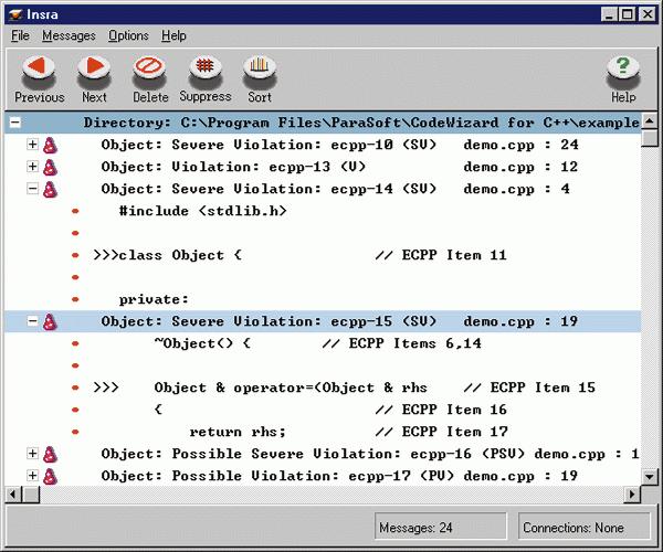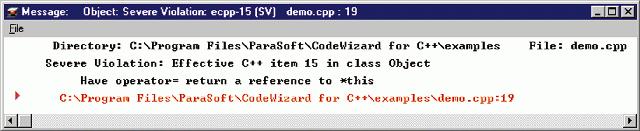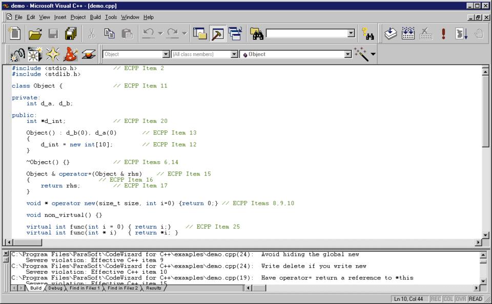Enter CodeWizard by ParaSoft, a tool that searches through your code for violations of good C++ coding standards. Based on programming ideas from Scott Meyers' books Effective C++ and More Effective C++, CodeWizard automatically enforces thirty-five descriptive rules or “items” for effective C++ programming—standards that significantly reduce the number of errors in your code. In addition to Meyers' rules, ParaSoft has included a list of thirty-six additional items.
