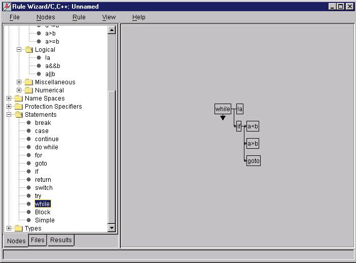 codewizard project.c -o projectYou can set the compiler for CodeWizard to use in a configuration file. CodeWizard then scans your code for any of the violations in its rule set. On a side note, you can suppress any of the rules (in case some of them make no sense when applied to your particular project), or you can add your own rules using RuleWizard (see Figure 3). There is a Motif GUI program, Insra (see Figure 4), that displays the error messages and allows you to open the source files, make any necessary changes, rebuild the program and retest the code for violations. If you want to keep everything strictly console-based, however, you can do that as well.