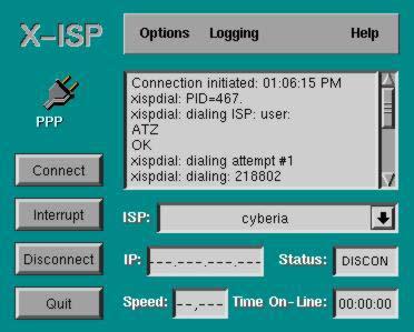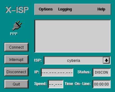 The user interface of X-ISP is very simple, intuitive and user friendly. It consists of a form with four buttons (Connect, Interrupt, Disconnect and Quit), three menus (Options, Logging and Help) and a drop-choice list of ISP entries (in case the user wants to configure the machine to dial more than one ISP). The “Options” menu contains the five items discussed below.